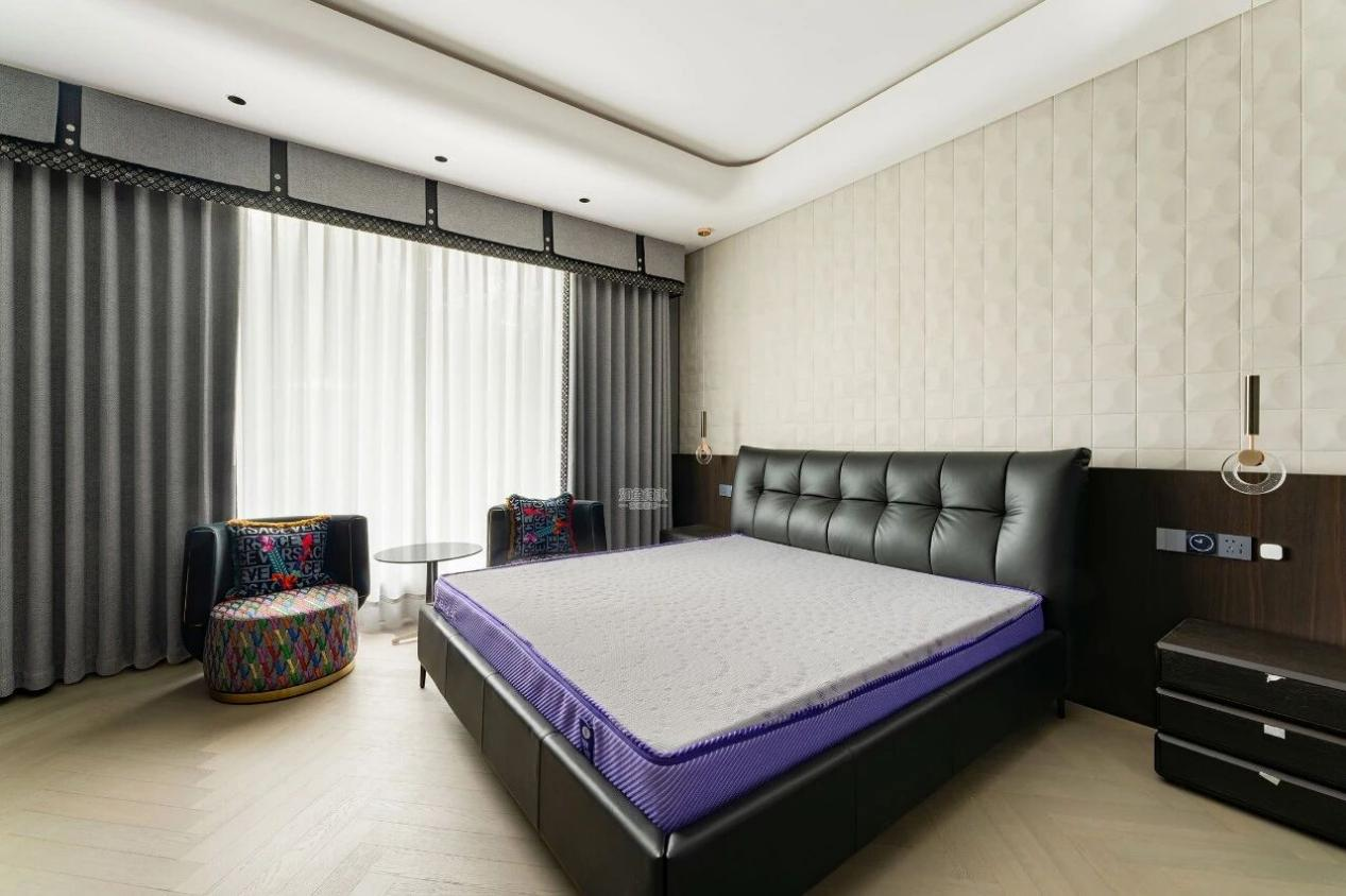- 黑色窗帘营造神秘高级感,适合大空间或影音室