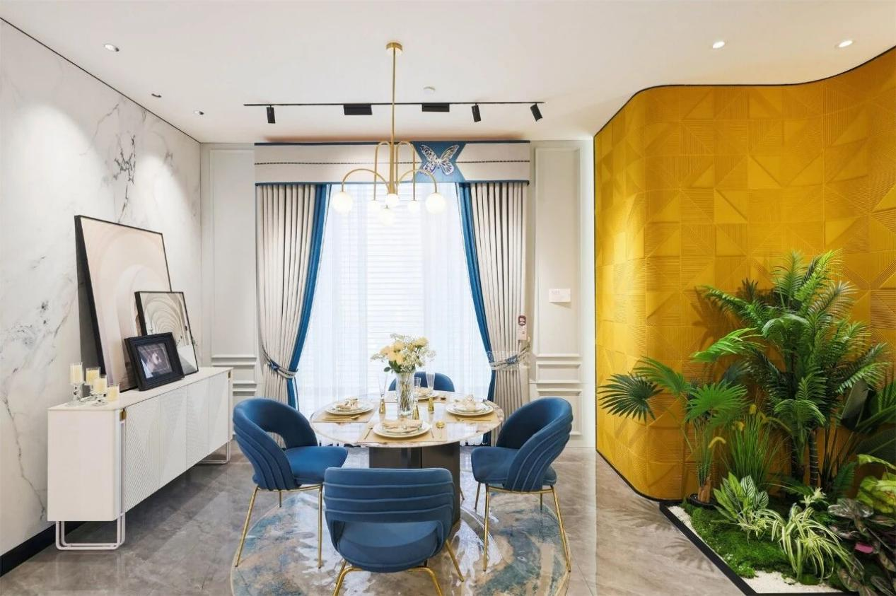 专业建议:蓝色窗帘与金属元素搭配,能瞬间提升空间质感。