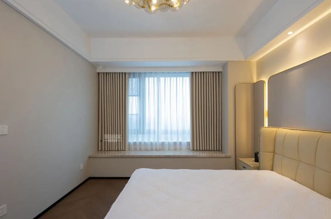 选择与墙面颜色相近的浅色系窗帘(米白、浅灰、淡咖等),创造无缝视觉空间。深色窗帘虽然大气,但会在视觉上"切割"空间,让墙面看起来更近更窄。