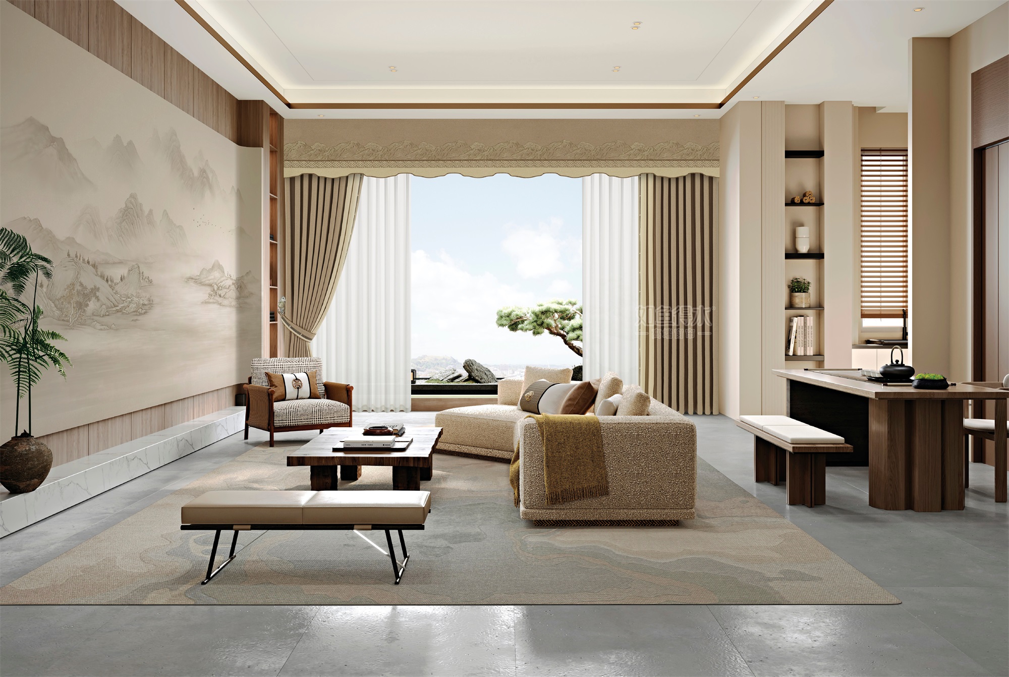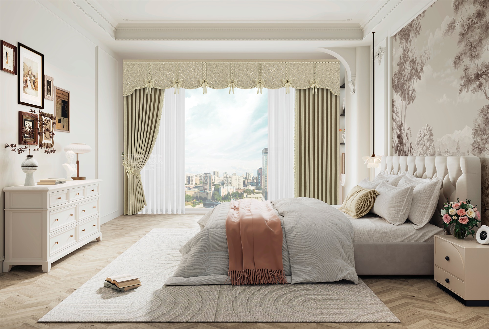 春眠-观山:设计灵感来源于中式山海,窗幔用双色刺绣生动描绘了群山起伏,皮革编织花边打造出既有东方韵味又不失现代感的空间氛围。