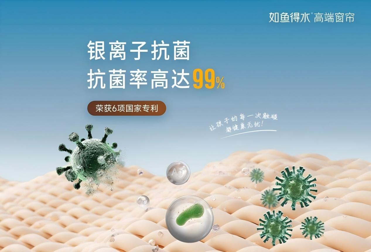 如鱼得水窗帘采用银离子抗菌技术,实现抗菌率99%,同时48小时除醛率高达93.4%。