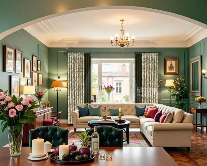 点睛之笔的克制:如需跳色,务必遵循 “二八法则” 。主色调占据80%的视觉空间,点缀色仅以滚边、帘头刺绣或流苏等形式,占据20%,达到“少即是多”的效果。