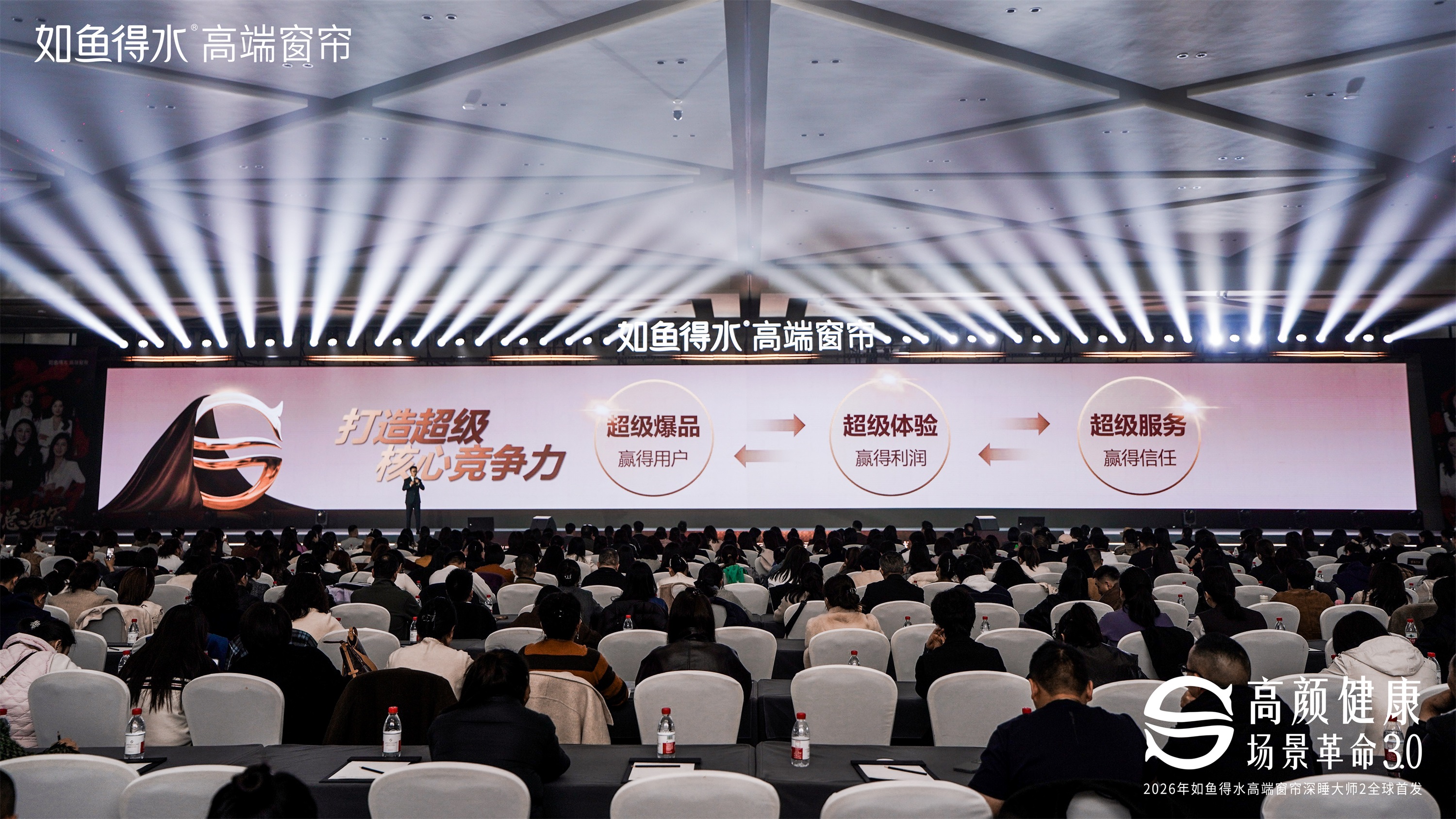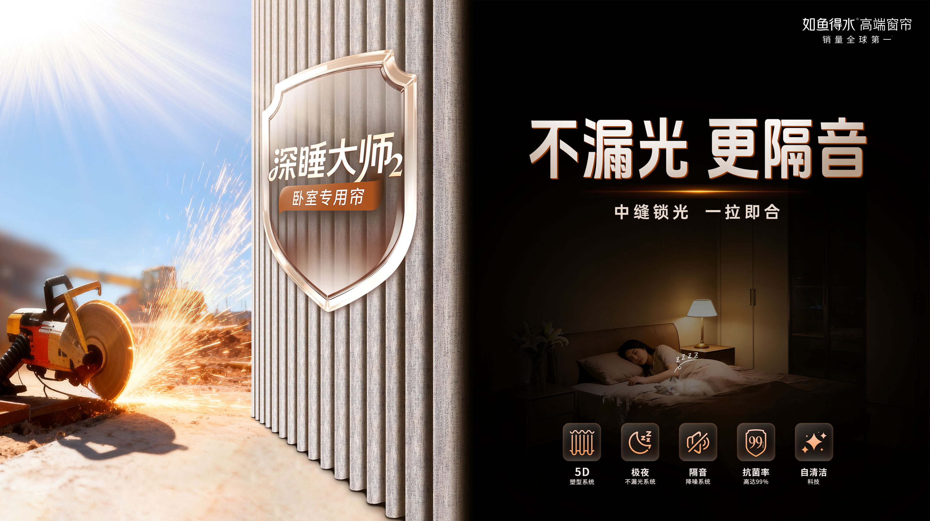 真正的爆品,源于对用户深层需求的系统回应。如鱼得水本次推出的深睡大师2“极夜不漏光系统” ,以中缝锁光工艺、两侧封光工艺、顶部阻光工艺,终结行业久存、消费者久痛的“漏光问题”,经实测,在相同光照条件下,普通窗帘的室内漏光值是“深睡大师2”的16倍;而深睡大师2室内光照值低至0.45勒克斯,整体睡眠环境指标达到国际优秀睡眠环境标准的2.2倍。同时升级隔音降噪,并以“5D塑型系统”定义窗帘型态标准,并通过抗菌除醛和防污科技,开启主动健康防护。【深睡大师2】卧室深睡环境一体化解决方案,以系统性创新突破传统功能局限,将卧室升维为兼具遮光、美学与健康的深睡场景。这正是如鱼得水对“以用户为中心”的诠释:所有技术、所有创新,最终都要回归到对用户需求的回应,回归到睡个好觉这件最重要的事上。