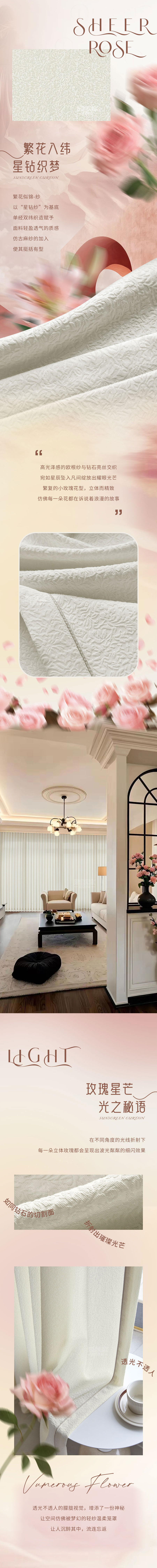 繁花似锦之名源于宋代诗人黄庭坚《豫章集》中春色满园关不住,繁花似锦映帘来的诗意。面料的玫瑰立体浮雕纹理,契合现代家居软装即艺术的美学主张,将花影婆娑的动态熔铸于方寸轻纱之中。