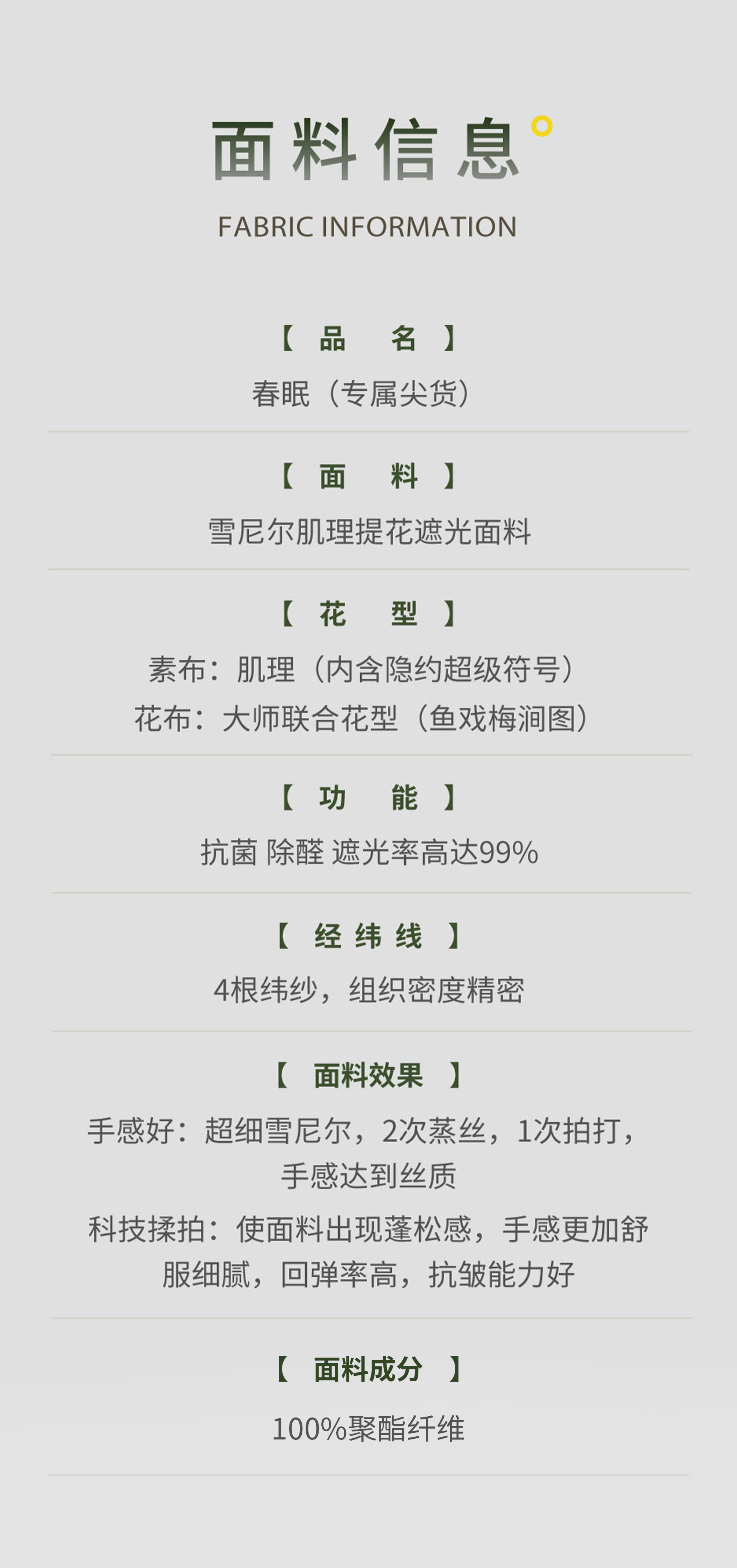 本款窗帘灵感源于法式卷草纹,有花开之意,伴随生生不息,万代绵长的美好祝愿。外帘是竖配立边款,主布采用温暖和煦的杏色,搭配舒缓白配布,色调柔和舒适。立边的防漏光工艺1结合舒缓的色调,能给予用户好的睡眠环境。幔头和帘身配布采用刺绣工艺,曲卷多变的走针,疏密有致的布局,无一不增添了花型的细腻美感,“如鱼得水”东情西韵专属符号的自然融入,营造柔美精致的空间氛围。