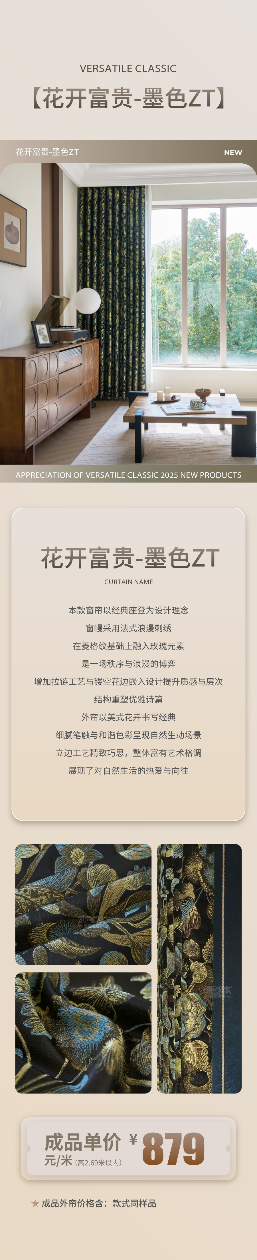 本款窗帘以经典摩登为设计理念,窗幔采用法式浪漫刺绣,在菱格纹基础上融入玫瑰元素,是一场秩序与浪漫的博弈,增加拉链工艺与镂空花边嵌入设计提升质感与层次,结构重塑优雅诗篇。