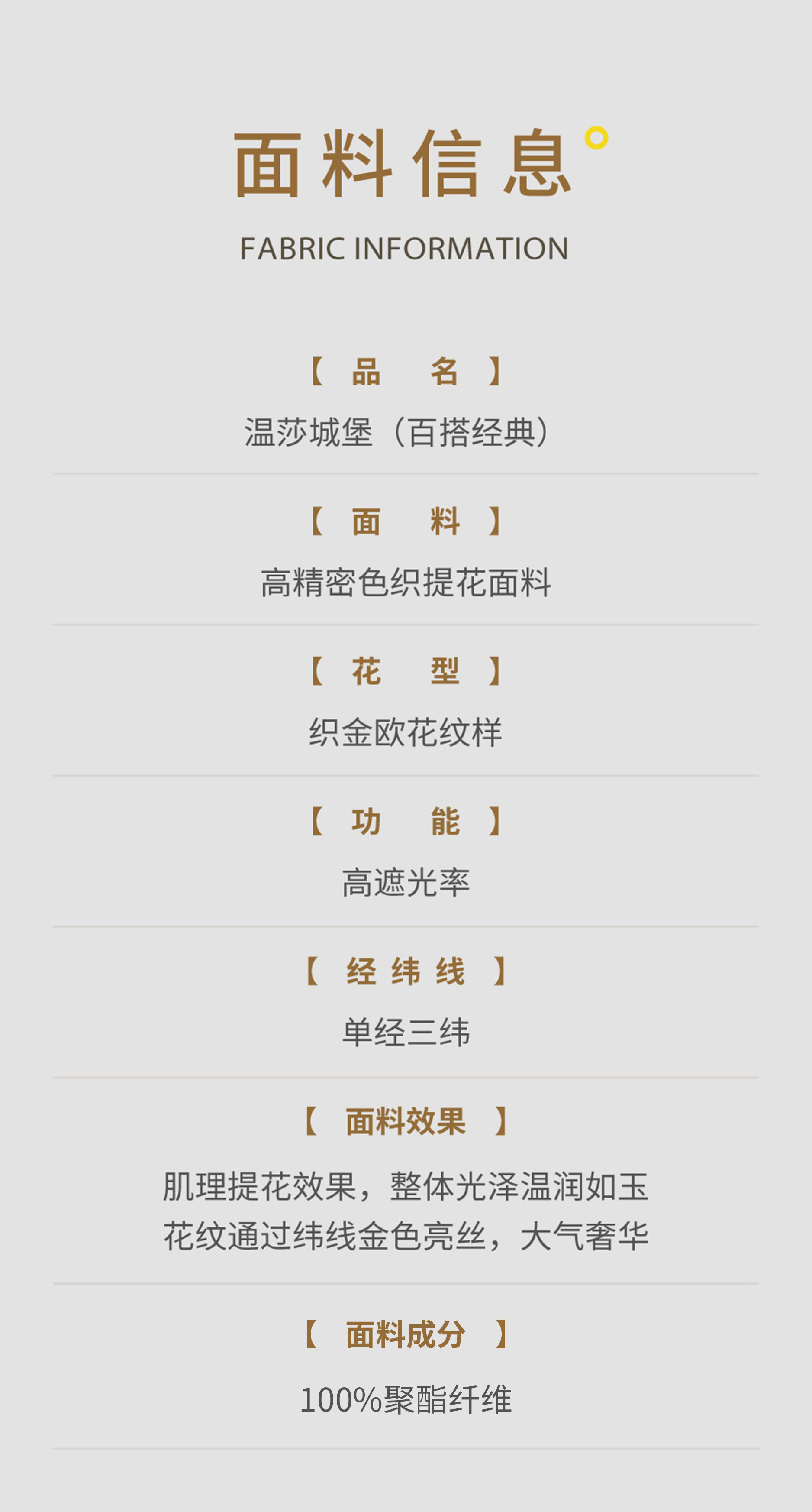 本款窗帘以欧式官廷风格为灵感,面料高贵经典的底色如午夜宫廷的蓝调时刻,浅金色提花若隐若现,似烛光摇曳下的巴洛克浮雕。纯色水波造型流畅的圆弧曲线与官廷风纹样的平幔形成视觉对比,彼此映衬,金色排穗花边的点缀加剧了整体造型的华丽感,辉煌绚丽。窗帘的浅金色立边与精致的组合花边,勾勒出窗帘的轮廓层次,实现了古典工艺与现代美学的完美融合,为空间赋予优雅与永恒的美感。
