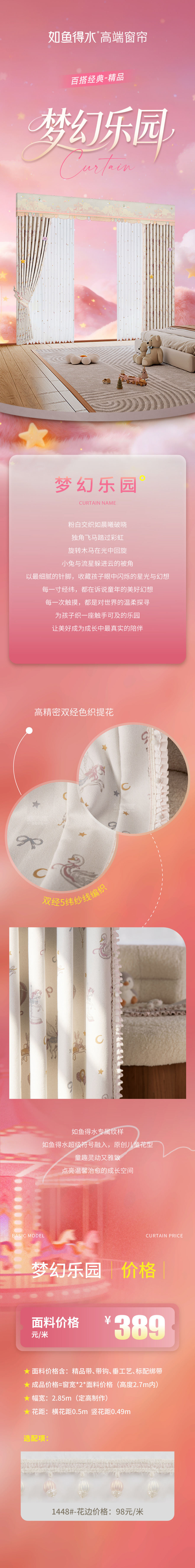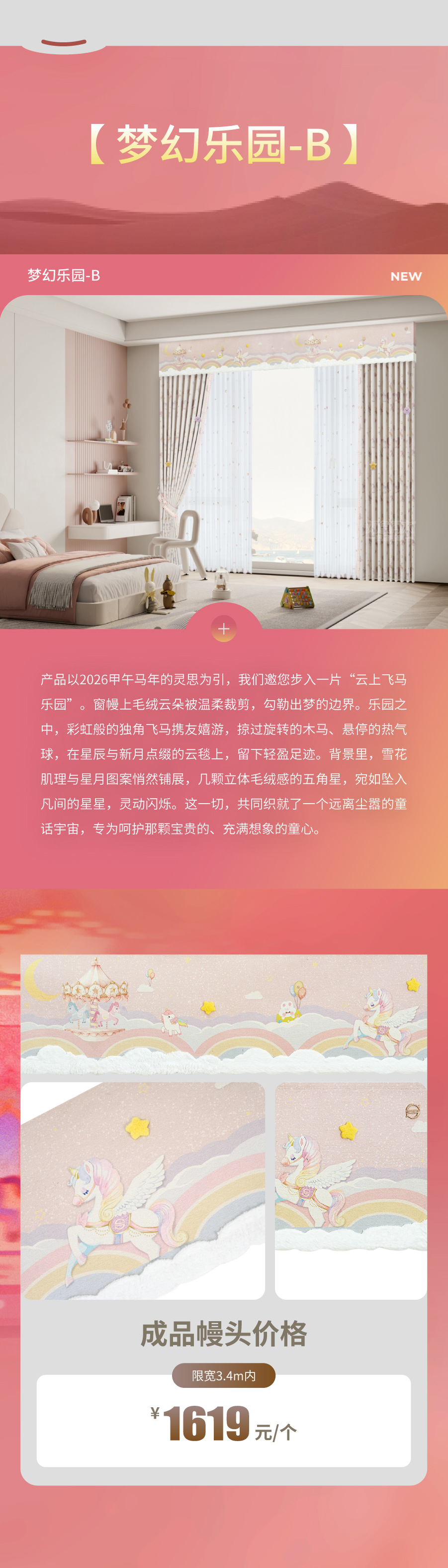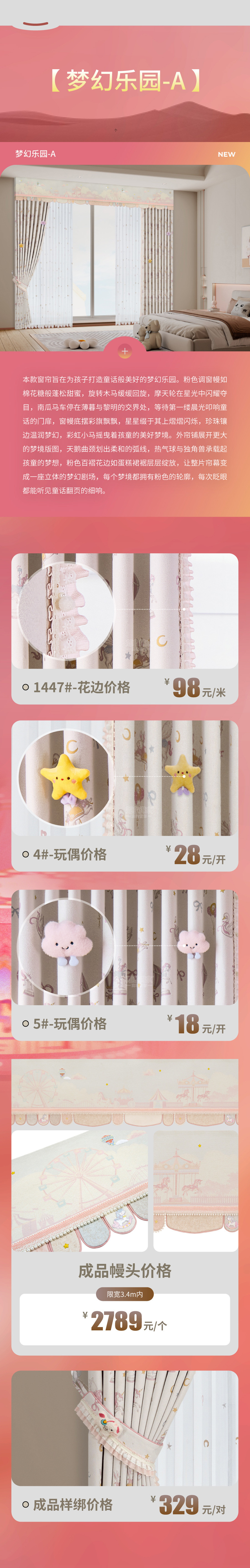 本款窗帘旨在为孩子打造童话般美好的梦幻乐园。粉色调窗幔如棉花糖般蓬松甜蜜,旋转木马缓缓回旋,摩天轮在星光中闪耀夺目,南瓜马车停在薄暮与黎明的交界处,等待第一缕晨光叩响童话的门扉,窗幔底摆彩旗飘飘,星星缀于其上熠熠闪烁,珍珠镶边温润梦幻,彩虹小马摇曳着孩童的美好梦境。外帘铺展开更大的梦境版图,天鹅曲颈划出柔和的弧线,热气球与独角兽承载起孩童的梦想,粉色百褶花边如蛋糕裙裾层层绽放,让整片帘幕变成一座立体的梦幻剧场,每个梦境都拥有粉色的轮廓,每次眨眼都能听见童话翻页的细响。