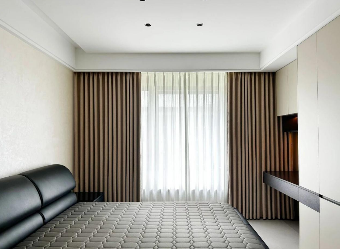 选择与墙面颜色相近的浅色系窗帘(米白、浅灰、淡咖等),创造无缝视觉空间。深色窗帘虽然大气,但会在视觉上"切割"空间,让墙面看起来更近更窄。