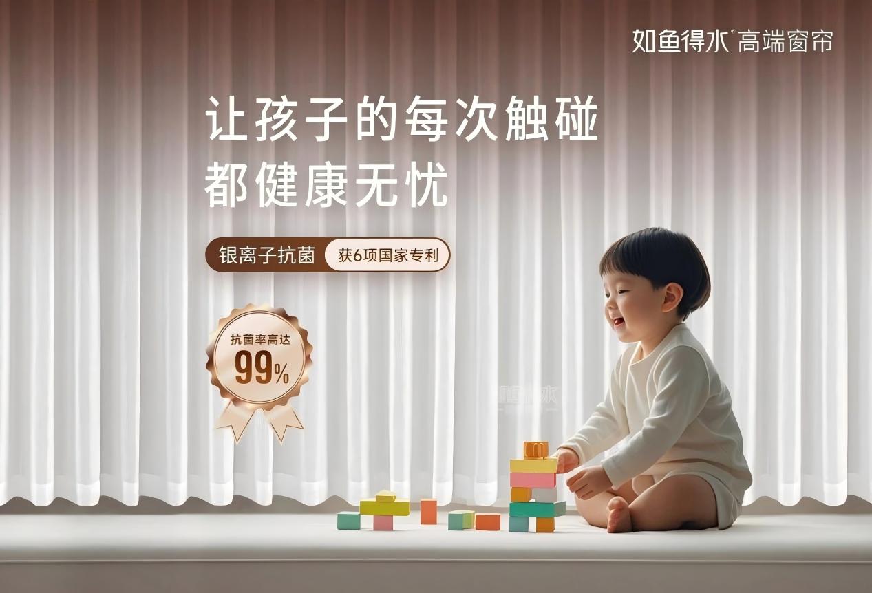 如鱼得水窗帘采用银离子抗菌技术,实现抗菌率99%,同时48小时除醛率高达93.4%。