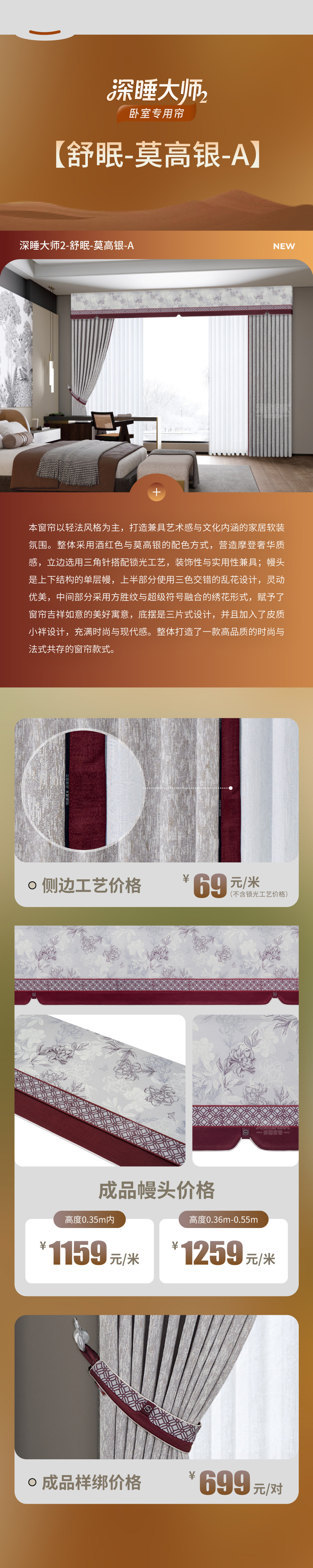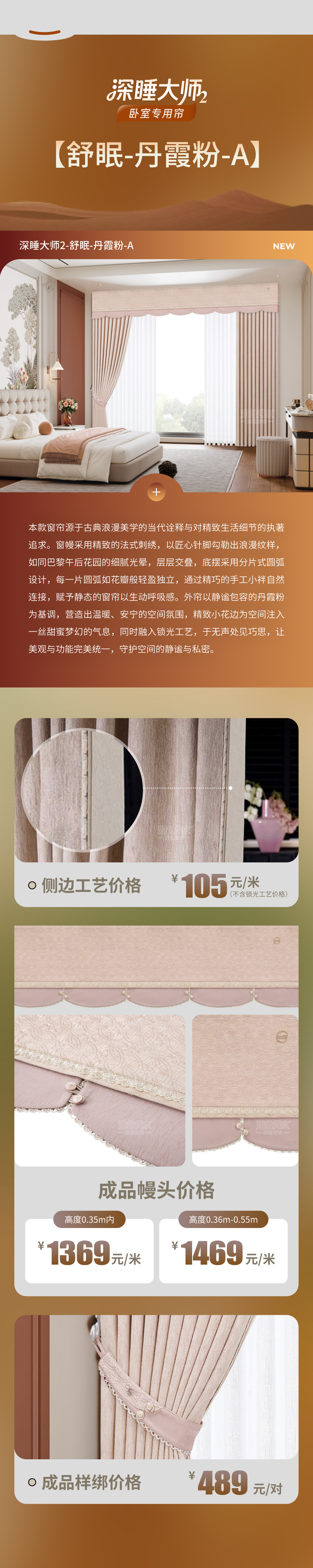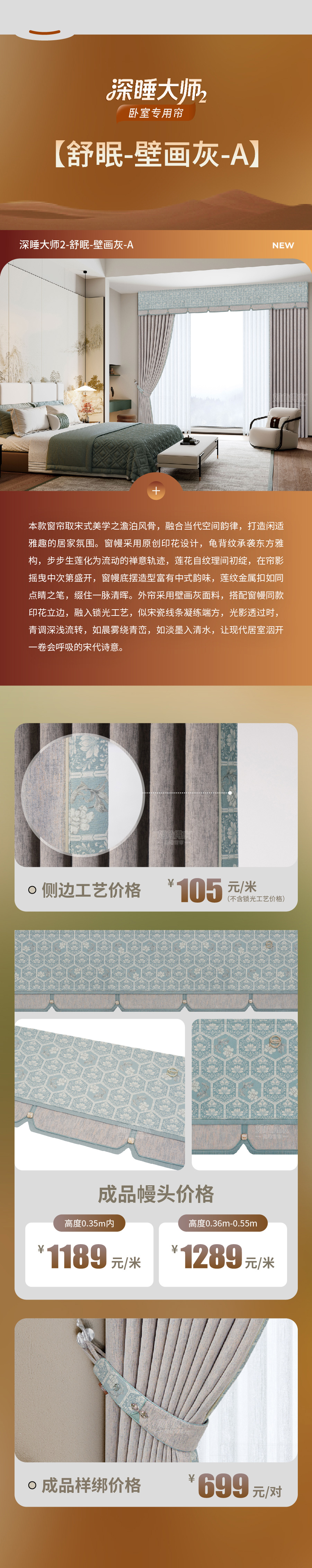 本款窗帘取宋式美学之澹泊风骨,融合当代空间韵律,打造闲适雅趣的居家氛围。窗幔采用原创印花设计,龟背纹承袭东方雅构,步步生莲化为流动的禅意轨迹,莲花自纹理间初绽,在帘影摇曳中次第盛开,窗幔底摆造型富有中式韵味,莲纹金属扣如同点睛之笔,缀住一脉清晖。外帘采用壁画灰面料,搭配窗幔同款印花立边,融入锁光工艺,似宋瓷线条凝练端方,光影透过时,青调深浅流转,如晨雾绕青峦,如淡墨入清水,让现代居室洇开一卷会呼吸的宋代诗意。