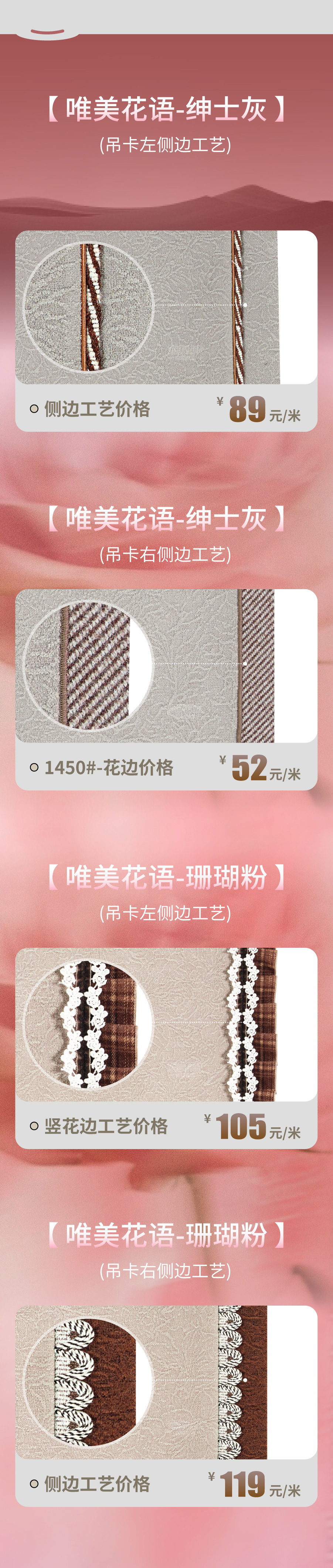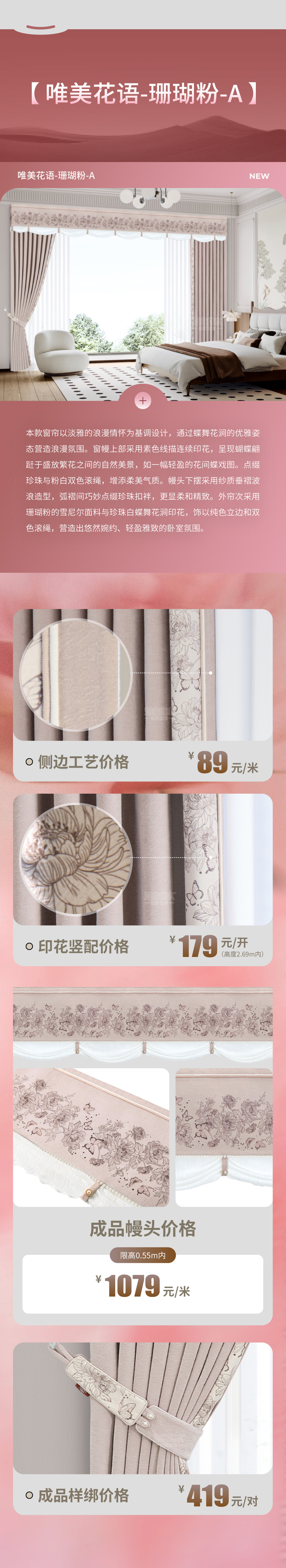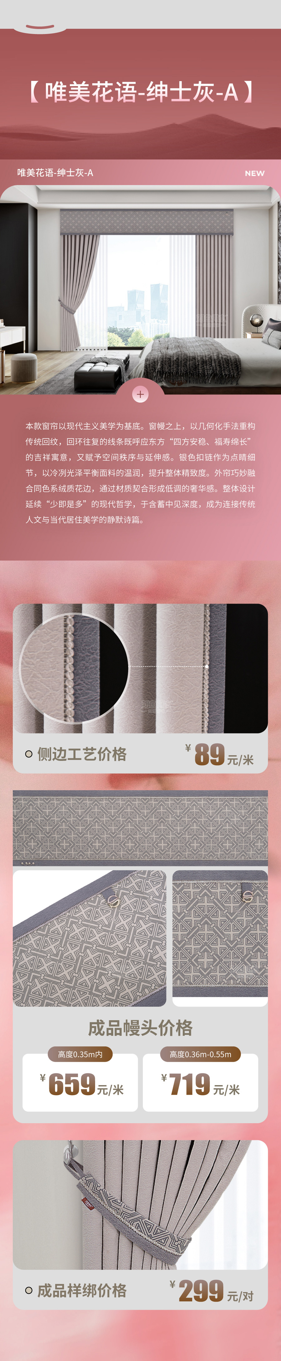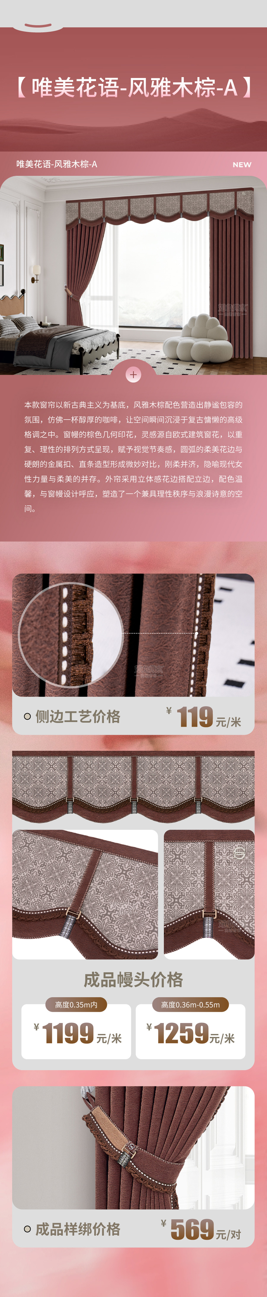本款窗帘以新古典主义为基底,风雅木棕配色营造出静谧包容的氛围,仿佛一杯醇厚的咖啡,让空间瞬间沉浸于复古慵懒的高级格调之中。窗幔的棕色几何印花,灵感源自欧式建筑窗花,以重复、理性的排列方式呈现,赋予视觉节奏感,圆弧的柔美花边与硬朗的金属扣、直条造型形成微妙对比,刚柔并济,隐喻现代女性力量与柔美的并存。外帘采用立体感花边搭配立边,配色温馨,与窗幔设计呼应,塑造了一个兼具理性秩序与浪漫诗意的空间。